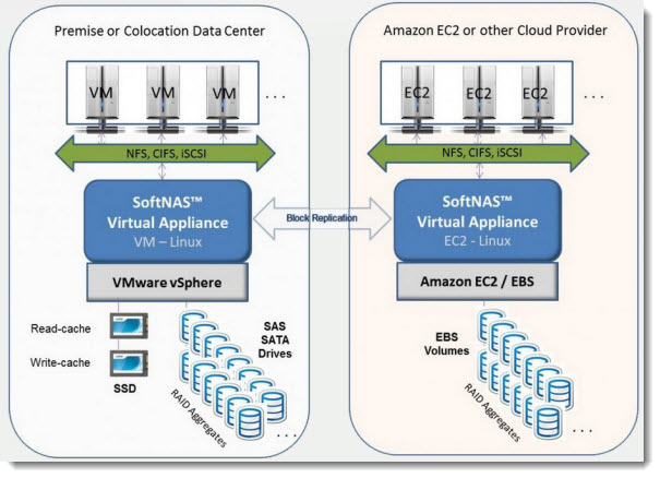 SoftNAS runs as a VM on VMware vSphere but also on Hyper-V or directly at Amazon as as a EC2 instance. Here is a screenshot from their website, where you can see the solution running locally and at Amazon. The replication between those two is block level, and the replication runs every minute.