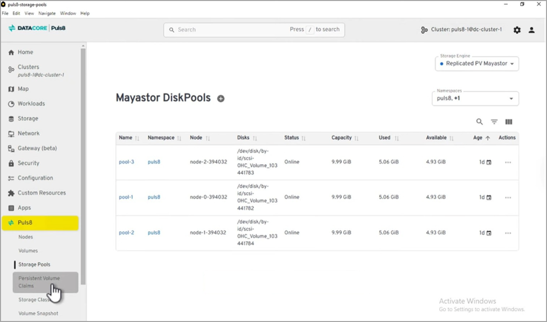 Puls8's GUI provides visibility into the storage topology – which volumes live on which nodes, replication status, capacity utilization, and health – without running multiple kubectl commands and parsing YAML output. For mixed teams where not everyone is a Kubernetes expert, or for organizations where the storage admin and the platform engineer are different people, this reduces the knowledge barrier significantly.