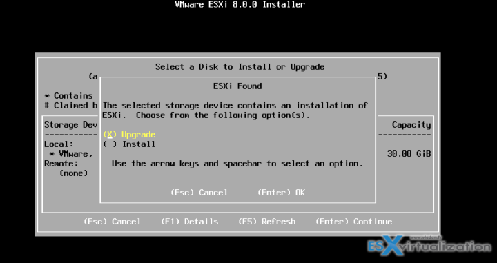 Then you'll se an option to install ESXi and choose between Upgrade or Install. The install option will wipe all the data from the selected storage device. It's not what you want if you're running your existing VMs there -:).