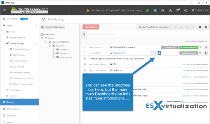 Monitoring and Activity – You can monitor your backup progress from multiple locations. One of them is from the Backups section menu. You can see which VMs have been backed up or which are backed up right now. But the best for this is probably the main Dashboard.