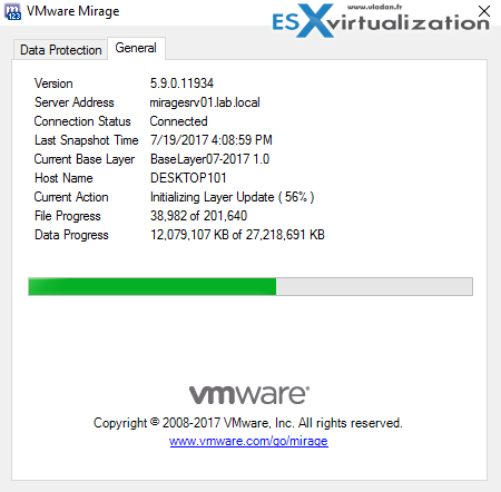 You can monitor the progress through the Mirage Admin dashboard. But also, you can go to the endpoint where by double-clicking the taskbar icon, General TAB shows us the progress details as well.