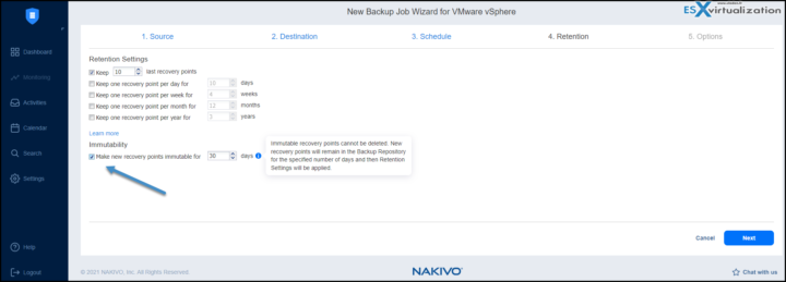 Nakivo also brings a hardened virtual appliance that allows you to create immutable backups (that you cannot delete) as a part of the local repository. It means that you don't have to have cloud storage supporting immutability (AWS, Azure …) in order to use it and protect yourself from ransomware attacks.