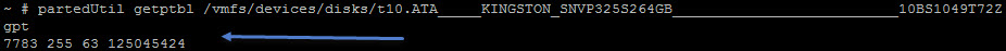 partedUtil getptbl “/vmfs/devices/disks/DeviceName”