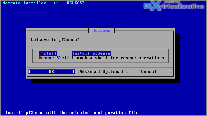 - Select “Installer disc image file (iso)” → browse to your downloaded pfSense ISO → Next