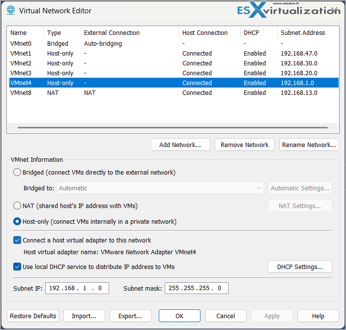 8. In VMware Workstaition: Edit > Virtual Network Editor > Change Settings button