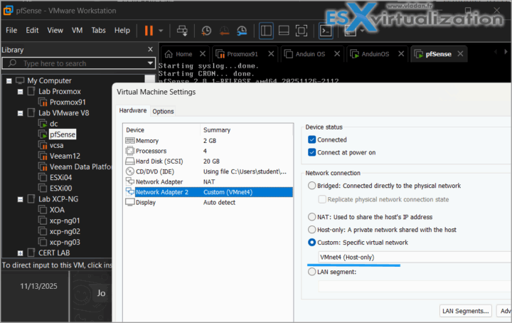 - Network Adapter 2 (LAN): Set to “Host-only” or create a new VMnet (recommended for isolated lab) or “Bridged” if you want your physical LAN behind pfSense. I put mine on VMnet4 which I adapted to fit the 192.168.1.x network, as my other VMNet networks were already occupied.