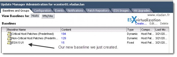 With the patches loaded into Update Manager, the next step would be to create a baseline group that you can use to remediate your hosts (or your clusters). To do so, select Baselines and Groups tab > Create. Put a name for that baseline and select the radio button as a host patch.
