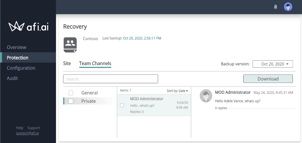 The new version features improved support of the Microsoft Team backup. In October 2020 Microsoft changed the location of Teams compliance records and their availability via API. The new version of Afi Microsoft 365 Backup takes into account this recent change, in order to provide uninterrupted service and granular backup of Microsoft Teams components. You can now use Afi to backup Teams private and public channels, 1-1 conversations, and their attachments.