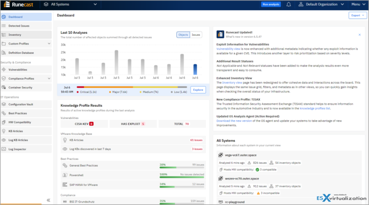 The main dashboard shows also the latest product news from Runecast, which has been lately updated. Also there is the widget called Selected System, so you know which information is displayed to you based on the connection to this or that remote system. This section also shows how many issues there are, when the environment has been scanned and how many inventory objects this system has.