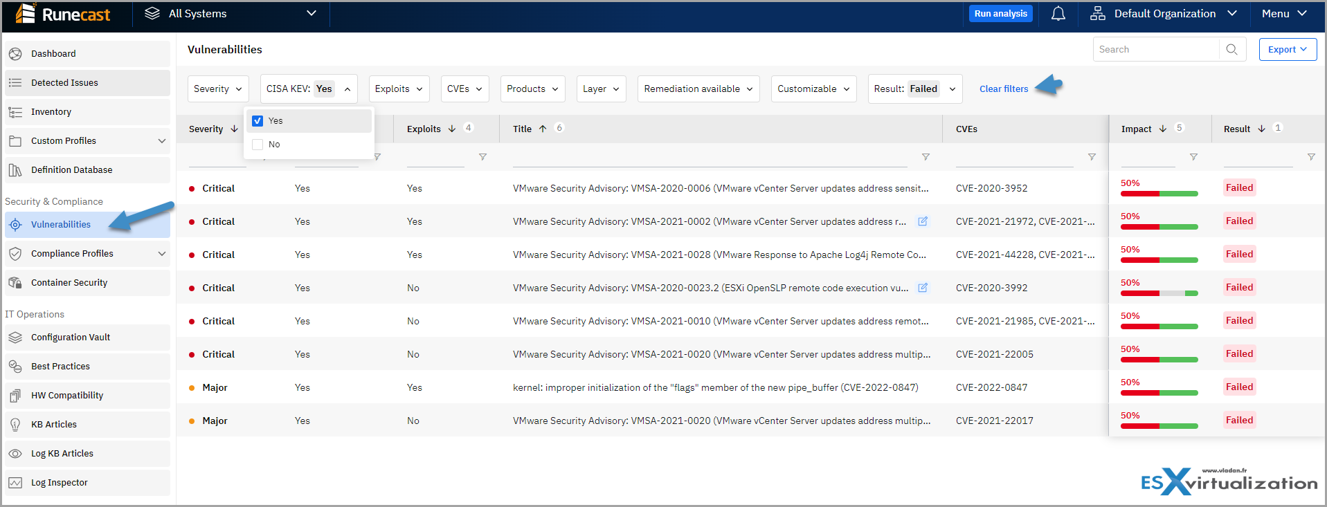 Runecast platform shows you all checks. Those ones which failed and need to be remediated, and also those ones that passed. Remember that with regular patching of your infrastructure you're closing doors for many vulnerabilities that have been discovered in the past. The UI then has many powerful filters allowing you to focus and view only only on what you are focusing.