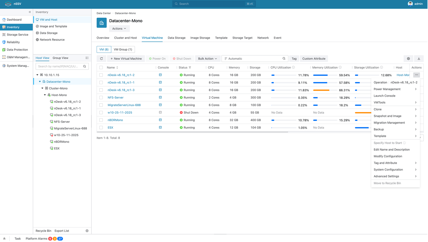 Compared to VMware where you need a vCenter server VM to be up and running, nSSV's management runs from the host, and its redundancy is ensured by replicating the data to another host (it's that simple as that). The management layer uses a lightweight, web-based console for oversight of clusters, monitoring, alerting, reporting, and operations. Extensive open RESTful APIs support automation with Ansible, Terraform, or custom tooling. HA provides automatic VM restarts on host failures, with multi-level failover mechanisms.