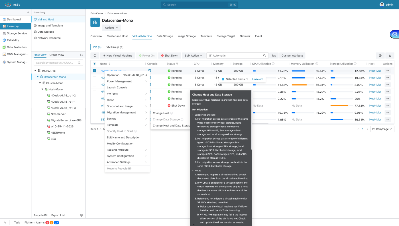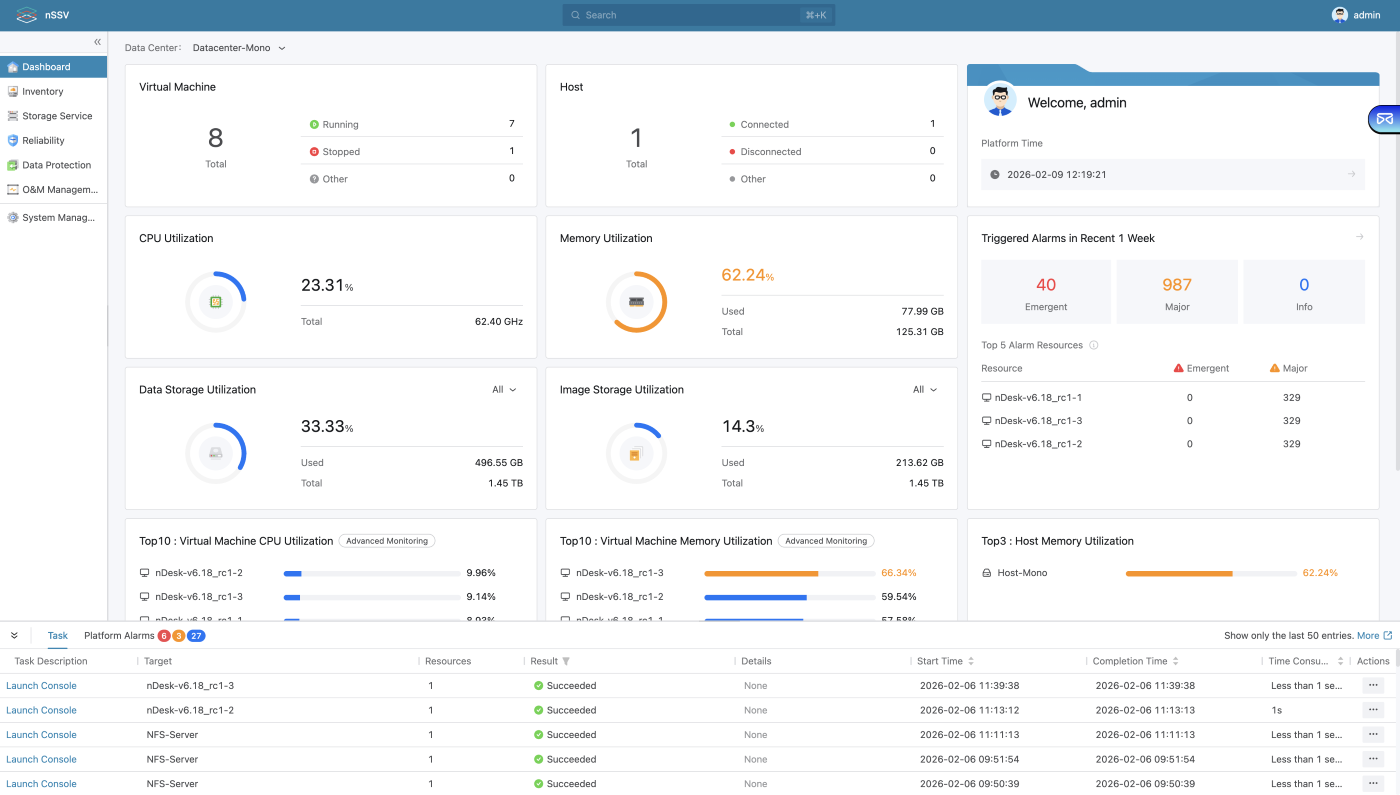 nSSV scales modularly—from a single node for small setups or labs to multi-thousand-node clusters with zero planned downtime for expansion. The hypervisor leverages KVM with enterprise enhancements: NUMA-aware CPU scheduling, EPT optimizations for reduced virtualization overhead, memory ballooning and overcommitment, transparent page sharing, and compression to maximize density.