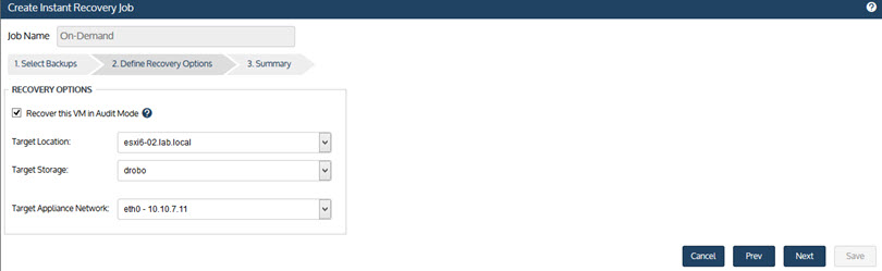 After hitting the Next button you are presented with the screen where you specify other options. The Audit mode option allows to verify that the VM can actually be created from the selected backup.