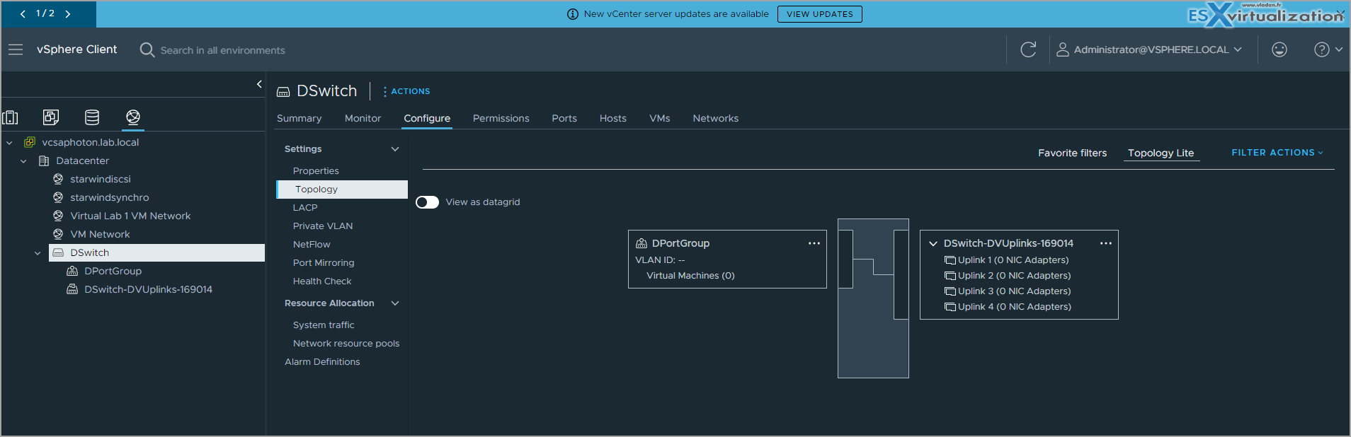 You can modify all vDS settings from here. You can change the vDS name, configure uplinks, activate NIOC, LACP, Private VLANS, Port Mirroring, create DVswitch port groups …
