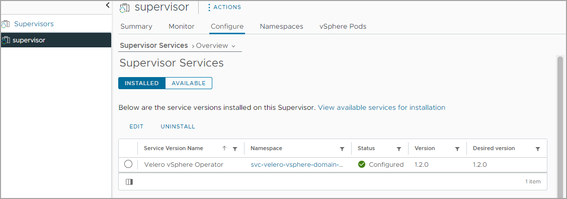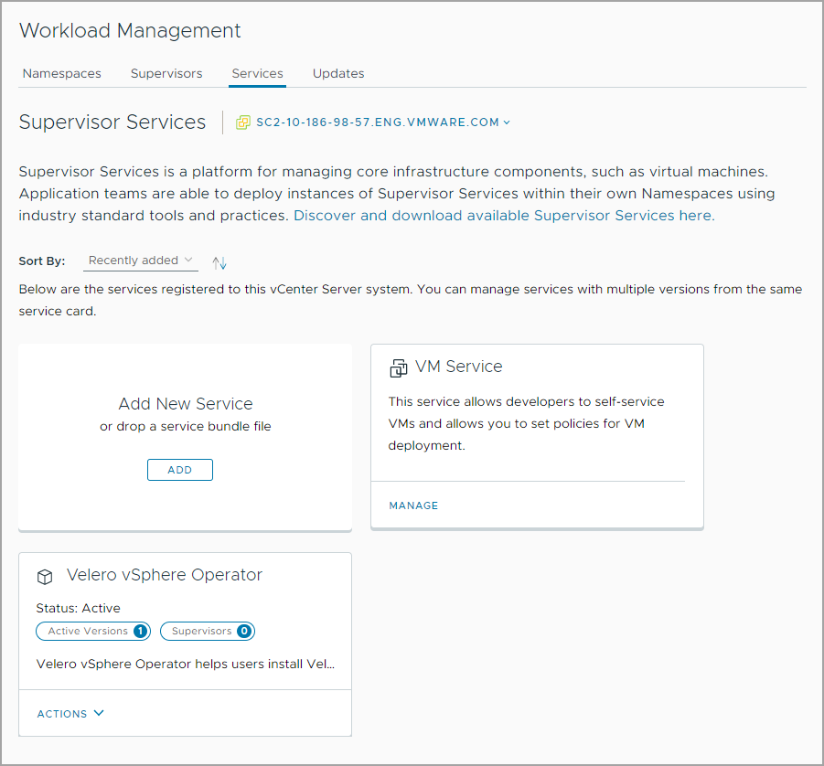 - The Supervisor Service and all of its information is registered with the vCenter system. The service is in Active state.
