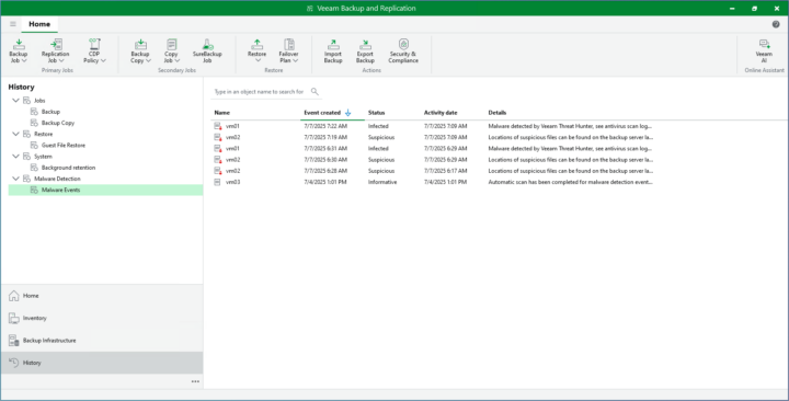 • Veeam Threat Hunter: ML/heuristic scanning of restore points.