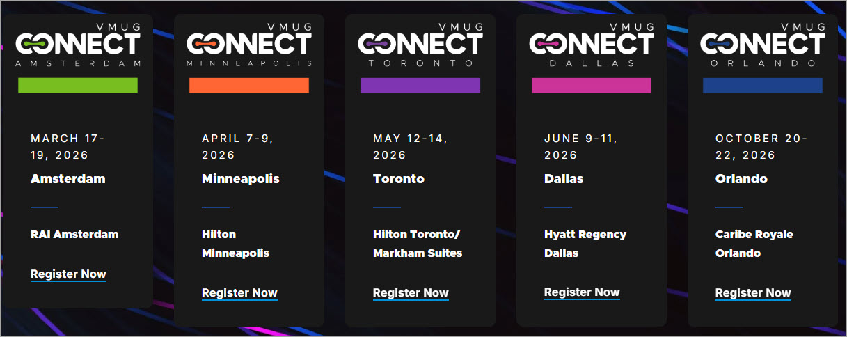 In 2026, VMUG Connects will be hosted in Amsterdam, Minneapolis, Toronto, Dallas, and Orlando to make it easier for VMUG members everywhere to participate. Check out all the locations and register here.