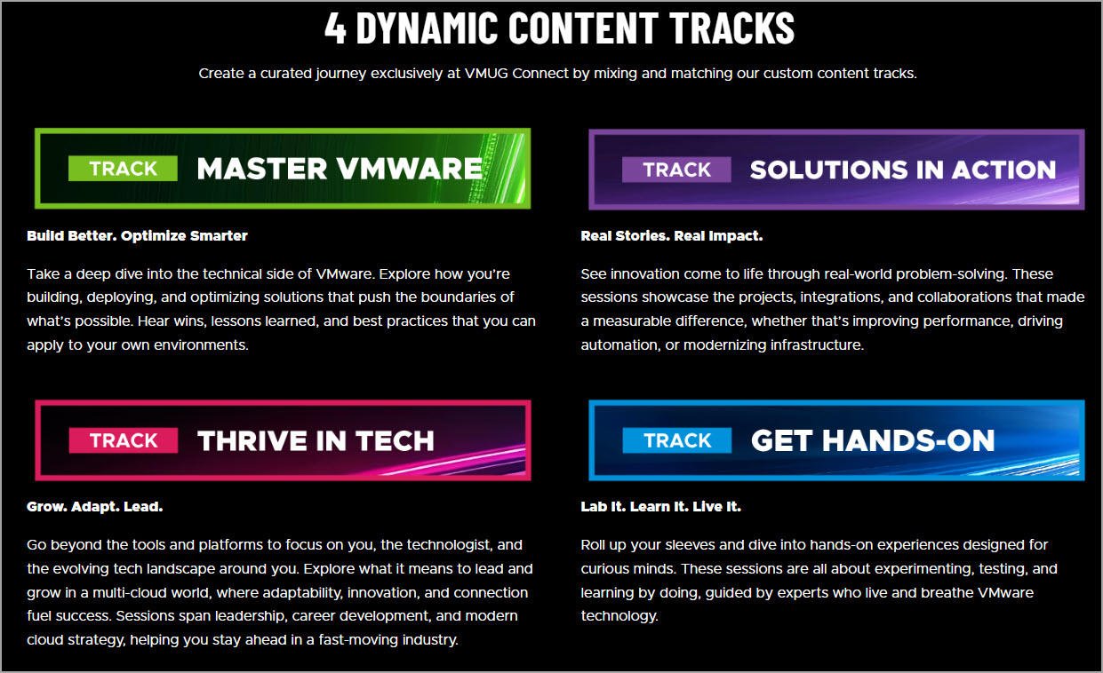 Let's geek out on the agenda – because that's where Connect shines brighter than a fresh ESXi install. Over 40 sessions across four tracks mean you curate your own adventure. No more FOMO from parallel tracks; pick what fuels your fire.