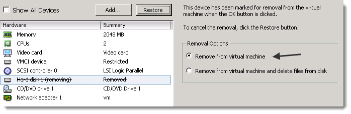 01. Remove your backup destination disks from your VDR VM – So the first thing to do if you use VMDK as a destination on a datastore, is to “unlink” this virtual disk from your existing VDR 1.2 appliance. So first look at the configuration of your existing VDR and see where is the destination. If it's a VMDK on a datastore, then you can simply remove the disk from the VM but leave the other radio button alone !!