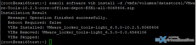 esxcli software vib install -d /vmfs/volumes/DATASTORE/VMware-Tools-10.2.5-core-offline-depot-ESXi-all-8068406.zip
