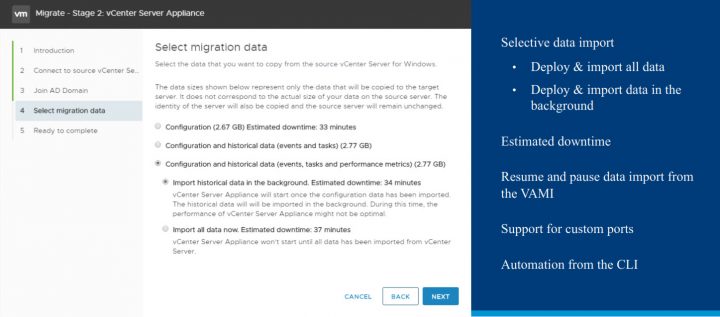 Migration data can be brought over into the vCSA 6.7, and newly you have a choice about not only what you'll bring over. If it's config, config and historical data (events and tasks), or if it's config and historical data (events tasks and performance metrics).