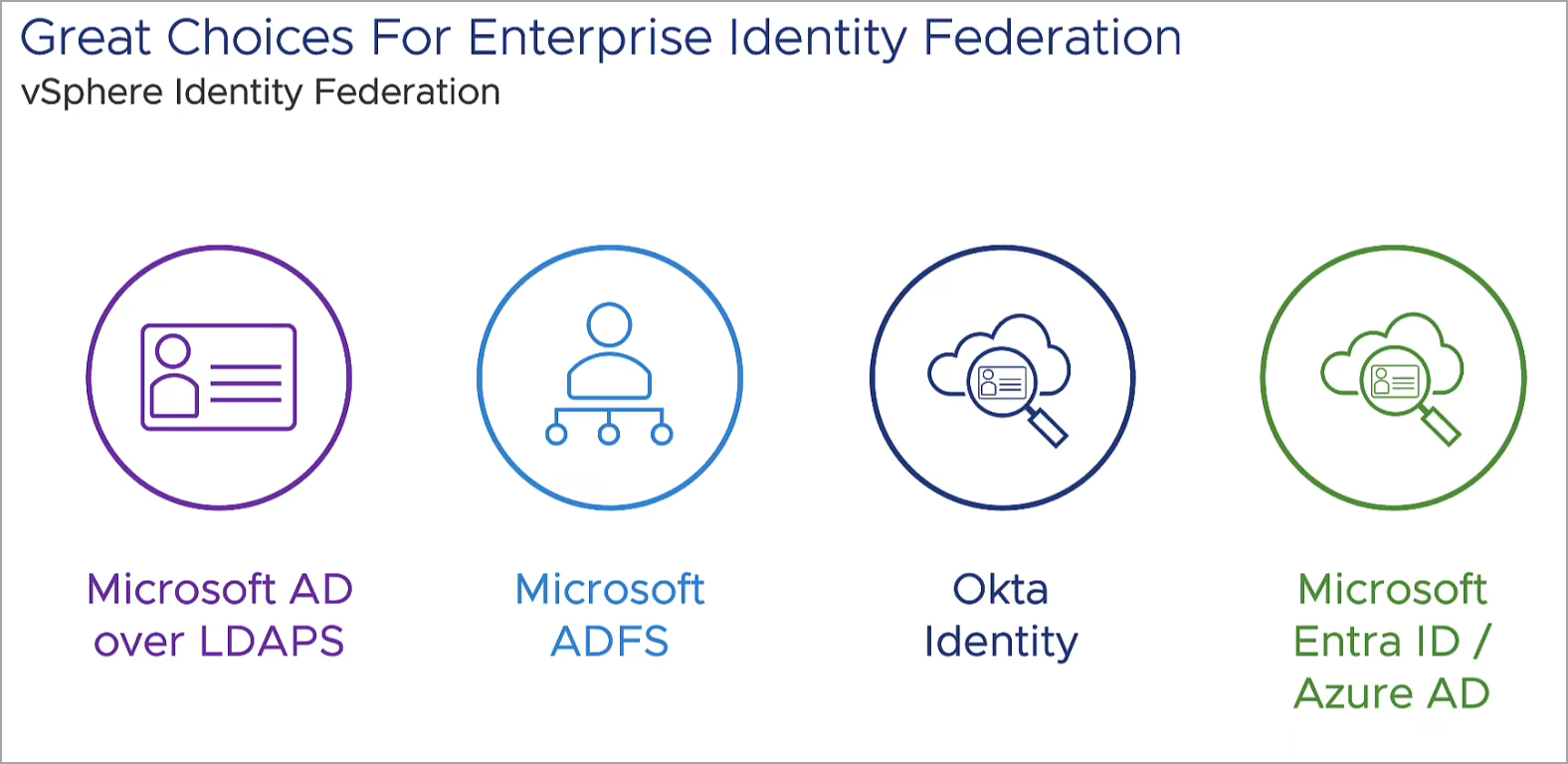 VMware vSphere 8 identity federation provides organizations with a powerful tool to simplify identity management and enhance security across different domains, vCenter servers. The U2 adding more choices for identity providers. Because it is federates identity it means that vSphere never sees the users credentials. It helps with security, but also for compliance.